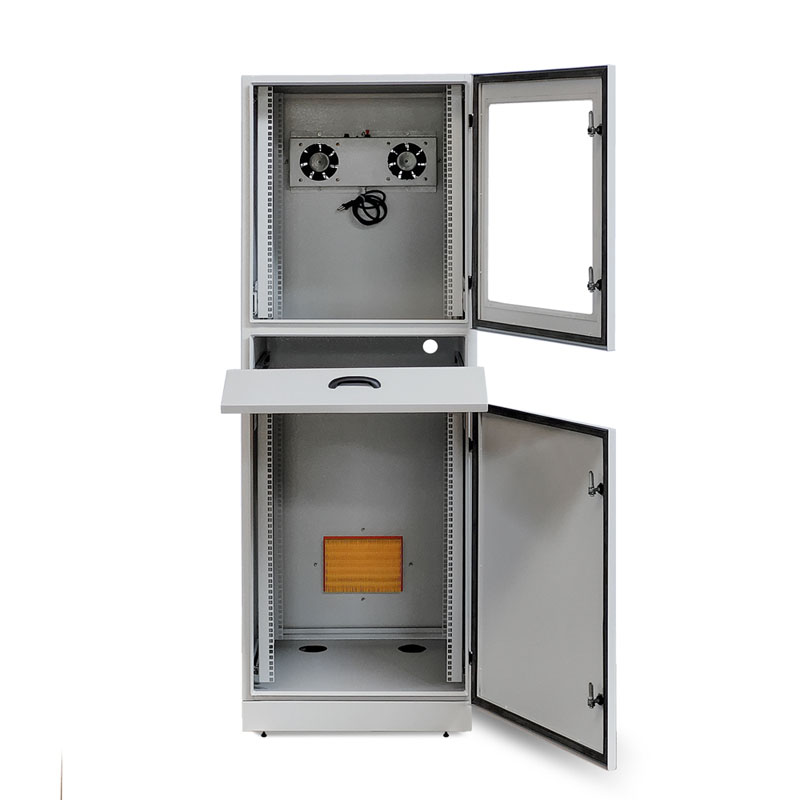 O Rack Industrial 19” polegadas da Racktron é fabricado com chapas de aço carbono de 1,5mm de espessura e estrutura monobloco soldada, o que garante maior estabilidade e segurança. O acabamento é feito em pintura pó eletrostática de alta resistência. As portas, fechamentos e gaveta, possuem vedação com borracha. As entradas e saídas de ar têm filtros contra pó. Esse modelo possui espaço superior para monitor, espaço central para teclado e mouse e espaço inferior para CPU e impressora. Possui grau de proteção IP54, o que significa uma proteção contra poeira e contra jato d’água.
